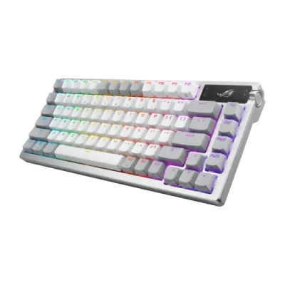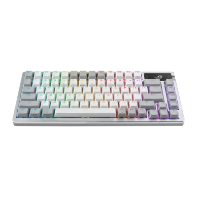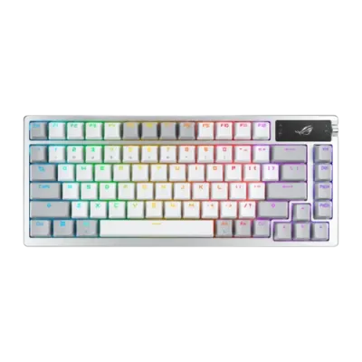 The Asus ROG Azoth M701 Snow White Switch RGB Mechanical Keyboard is a premium 75% compact gaming keyboard designed for ultimate performance and aesthetics. Featuring ROG Snow White mechanical switches, it delivers smooth keystrokes with a perfect balance of tactile feedback and actuation speed. The gasket-mounted design ensures a softer typing feel, while the customizable OLED display adds a touch of personalization. With tri-mode connectivity (USB, Bluetooth, and 2.4GHz wireless), this keyboard offers flexibility for gamers and professionals alike. The PBT keycaps, dampening foam layers, and ergonomic design make it the perfect addition to any gaming setup.