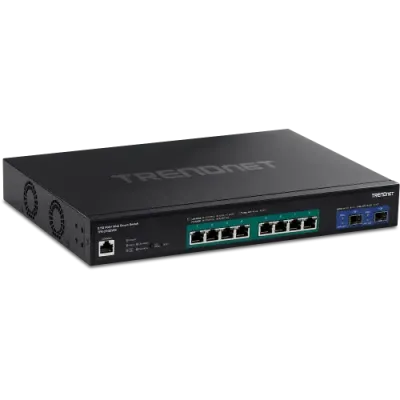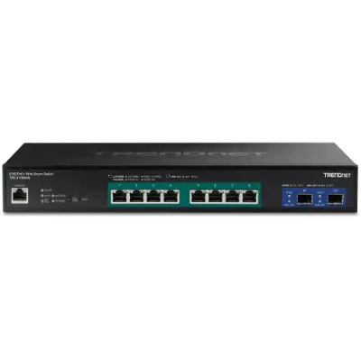 The TRENDnet TPE-3102WS is a 10-port Multi-Gig Web Smart PoE+ switch designed for high-speed network environments. Featuring 8 x 2.5GBASE-T PoE+ ports and 2 x 10G SFP+ slots, this switch supports blazing-fast data speeds of up to 5Gbps per port.