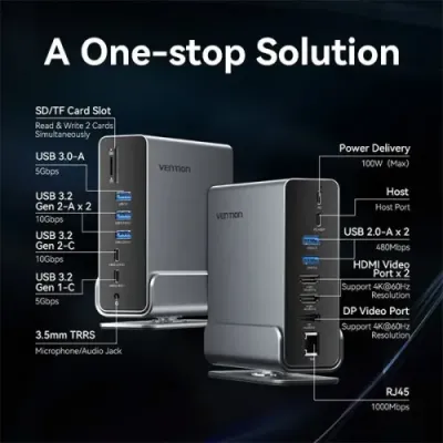 Enhance your workspace with the Vention TPUH0 15-in-1 Type-C Docking Station, a high-performance solution designed for power users, content creators, and multitaskers. This premium docking station expands your laptop’s connectivity with dual HDMI, DisplayPort, three USB 3.2 ports, three Type-C ports, Gigabit Ethernet, and an SD/TF card reader, ensuring maximum efficiency and productivity.